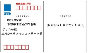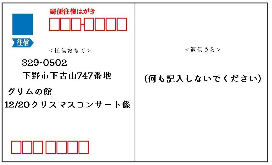 <往信おもて> 329-0502 下野市下古山747 グリムの館 12/20クリスマスコンサート係