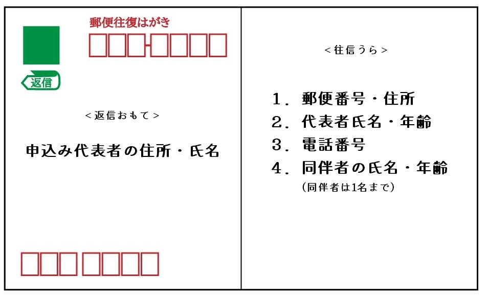 <往信う ら> 1.郵便番号、住所 2.代表者氏名、年齢 3.電話番号 4.同伴者の氏名、年齢